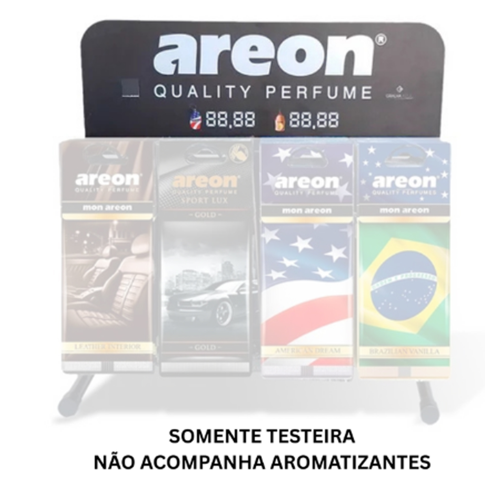 Este kit é uma testera projetada para exibir até quatro ganchos de aromatizantes Areon, proporcionando uma apresentação visual impactante. Com um design inteligente, ele permite que seus produtos sejam facilmente acessíveis e visíveis, aumentando as chances de venda.