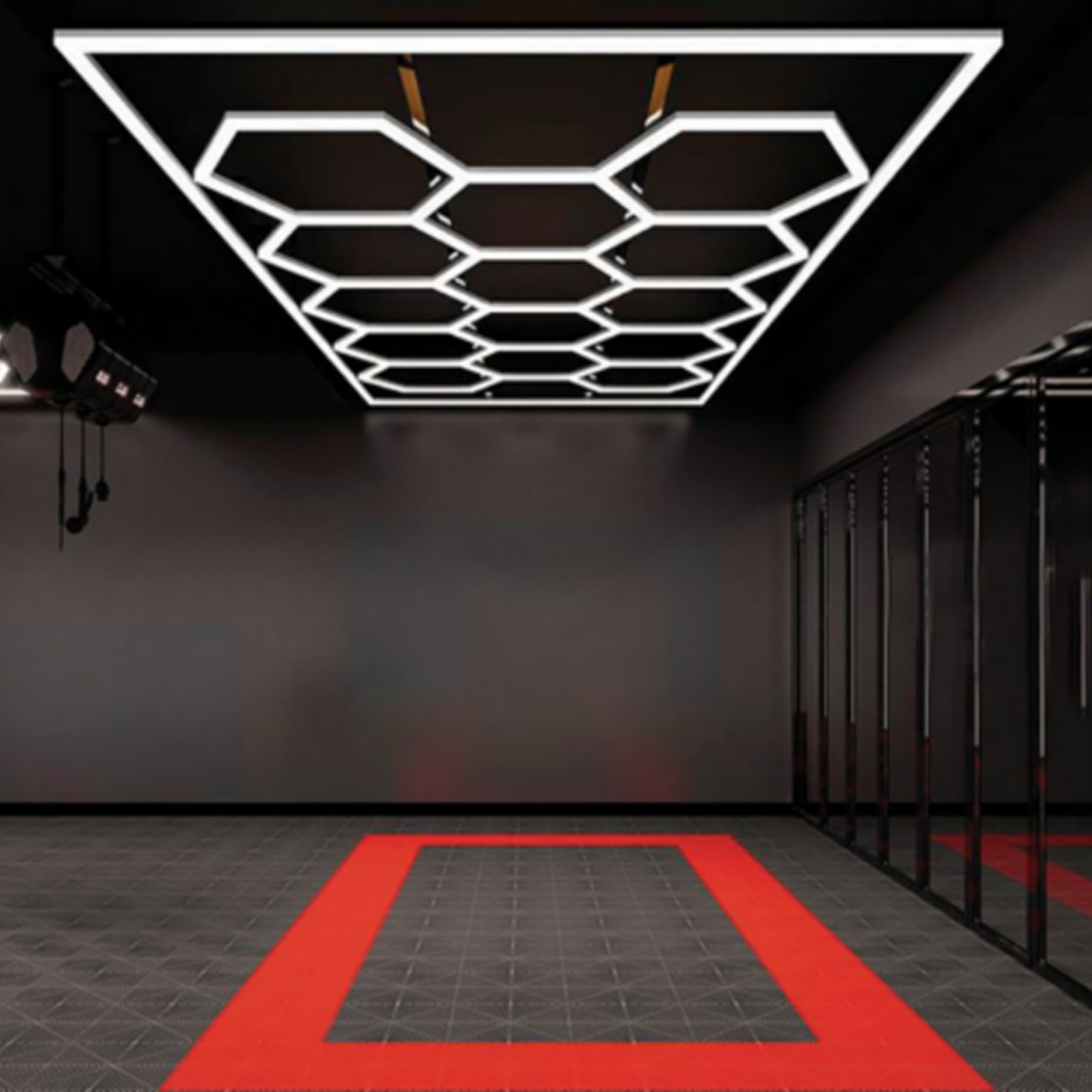 Seu design hexagonal moderno e funcional permite uma instalação no teto ou na parede, garantindo uma experiência visual elegante e eficiente. A luz branca intensa e precisa realça detalhes e imperfeições, sendo essencial para polimento e serviços de detalhamento automotivo.