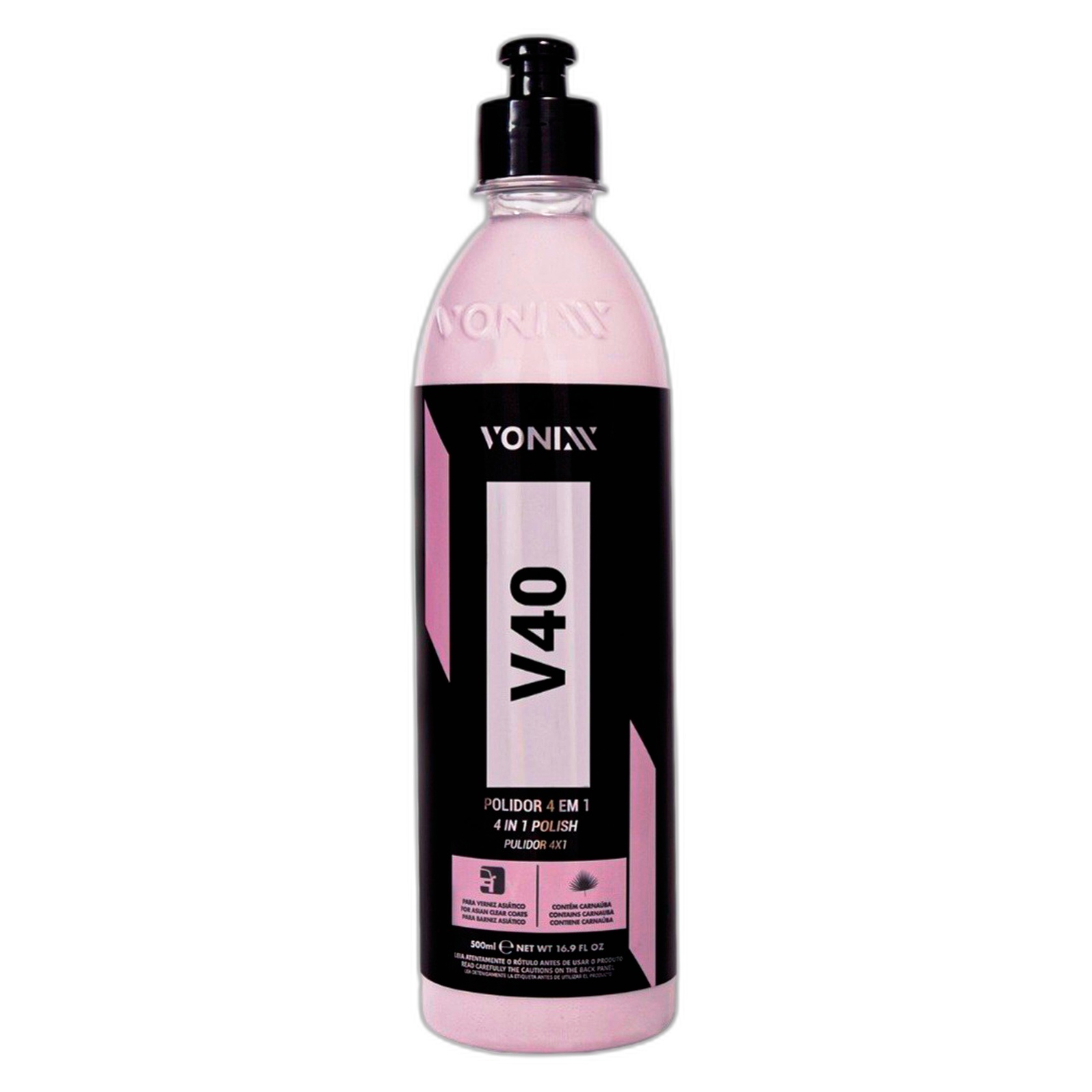 O Vonixx V40 é um composto polidor 4 em 1 de alta performance, desenvolvido para realizar corte, refino, lustro e proteção leve com eficiência e precisão. Indicado para vernizes asiáticos ou macios, o V40 entrega um polimento versátil com acabamento superior graças à presença de cera de carnaúba em sua fórmula exclusiva.